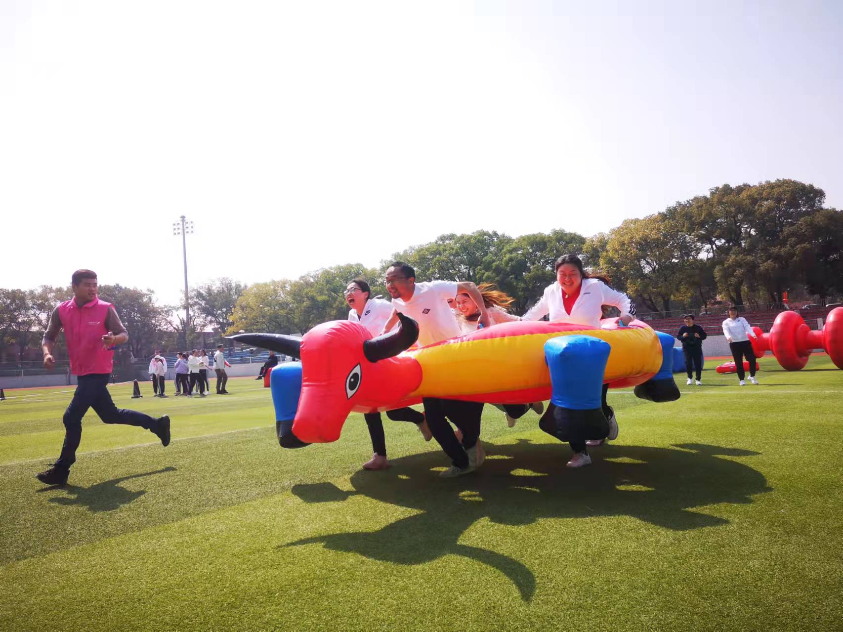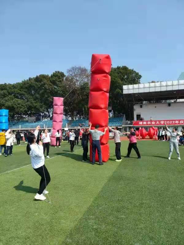 现场参赛的运动员们摩拳擦掌、热情高涨,公司共参加了奋勇奔腾、时代巨轮、步步高升、超级汉诺塔、龙行天下、陆地冰壶六个项目的比赛。随着进行简单的热身操后,比赛正式开始。