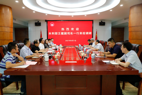 9月1日上午,水利部人事司副司长王健一行来校调研并召开座谈,湖南省水利厅人事处副处长唐光泽陪同,党委书记陈弘,副董事长张立,公司就创中心、教务处和vsport负责人参加,座谈会由陈弘主持。