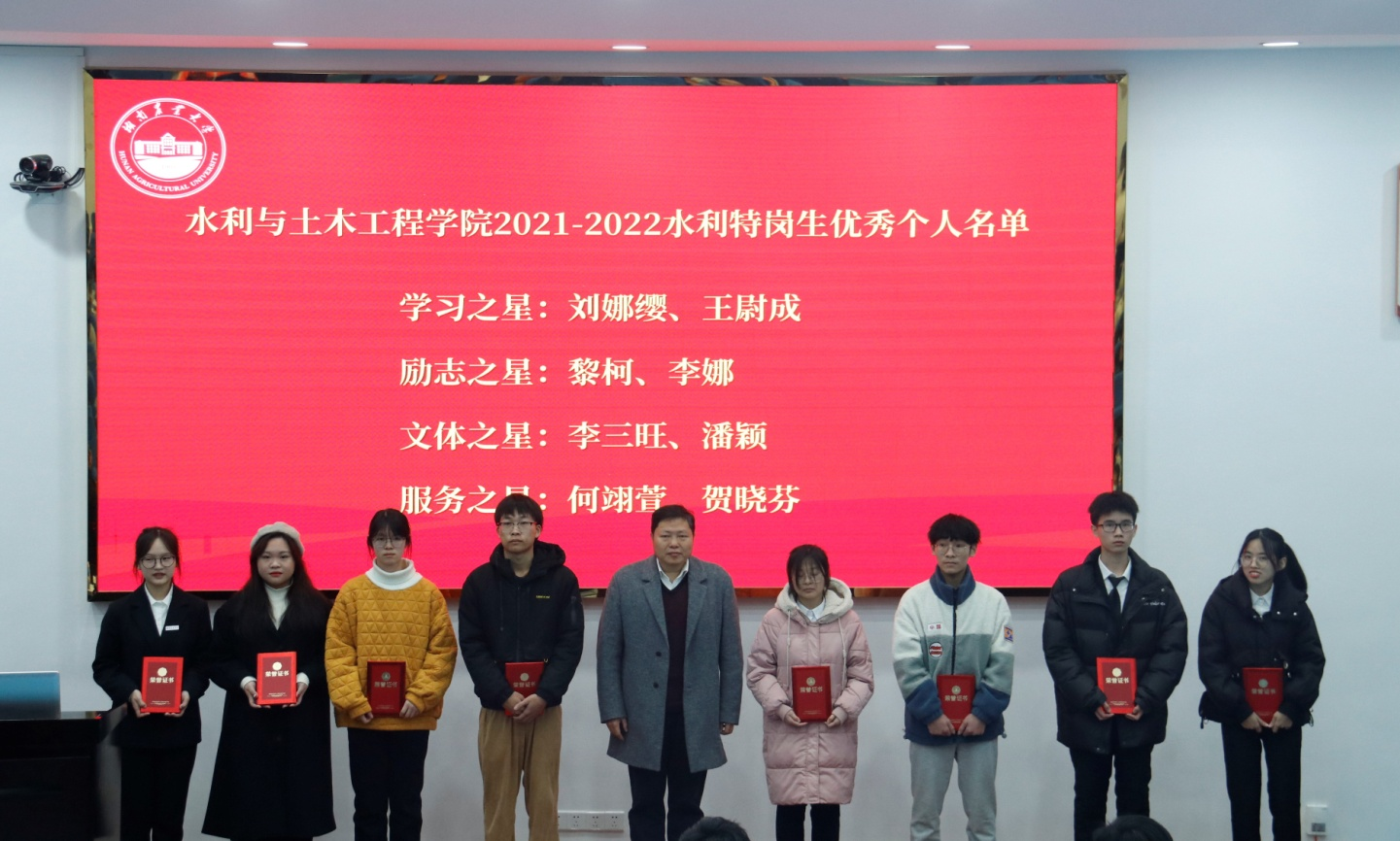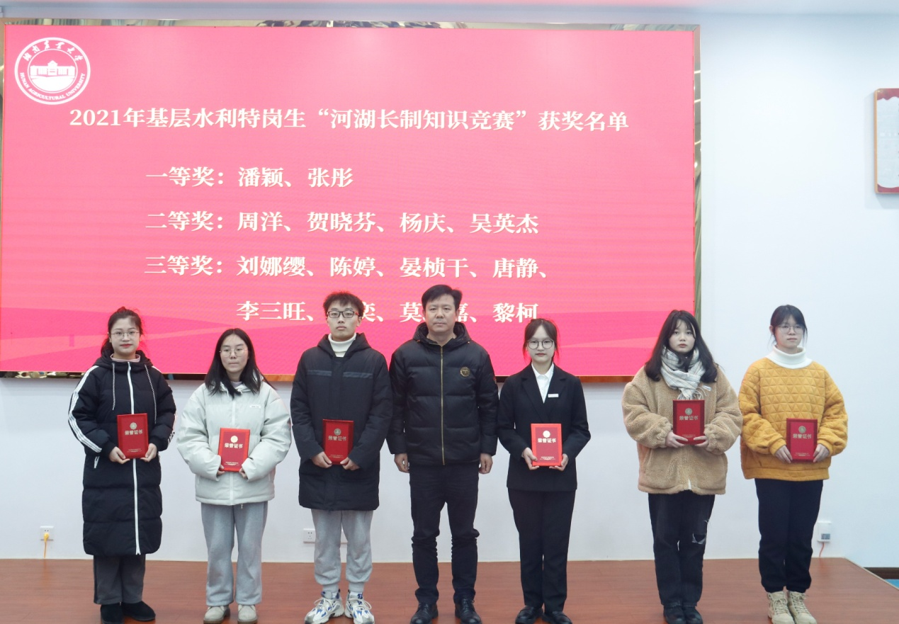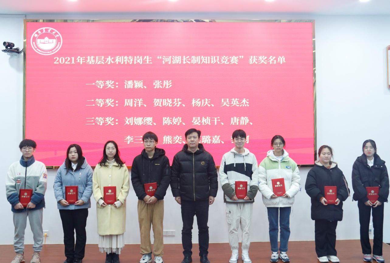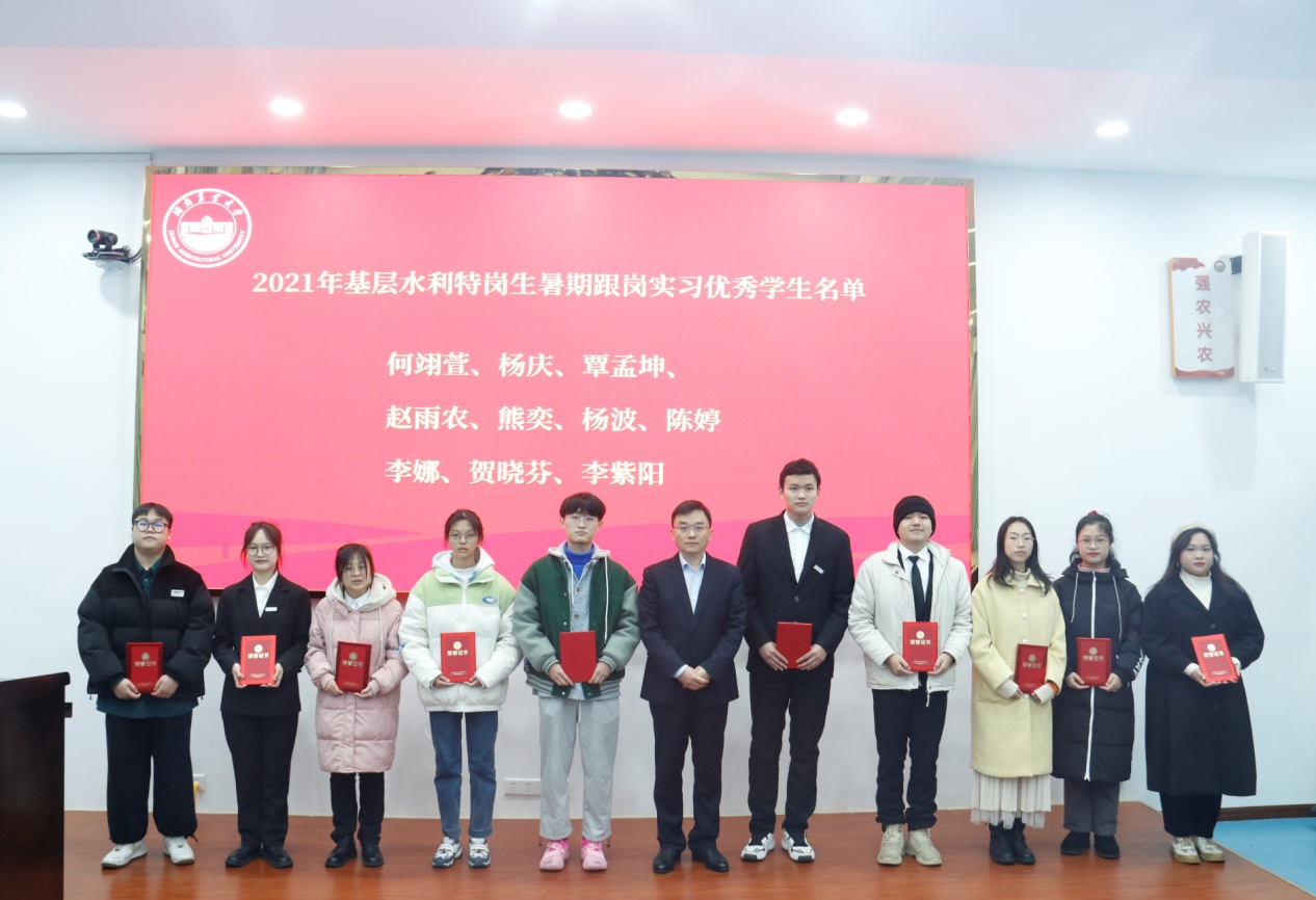 表彰环节,唐要善为荣获2021年学习之星、励志之星、文体之星、服务之星的基层水利特岗生颁奖,蒋龙华为2021年暑期跟岗实习优秀基层水利特岗生颁奖,程道国为2021年基层水利特岗生“河湖长制知识竞赛”获奖同学颁奖;董国生和李小湄为2021年基层水利特岗生“践行初心,绽放青春”演讲比赛获奖员工颁奖。