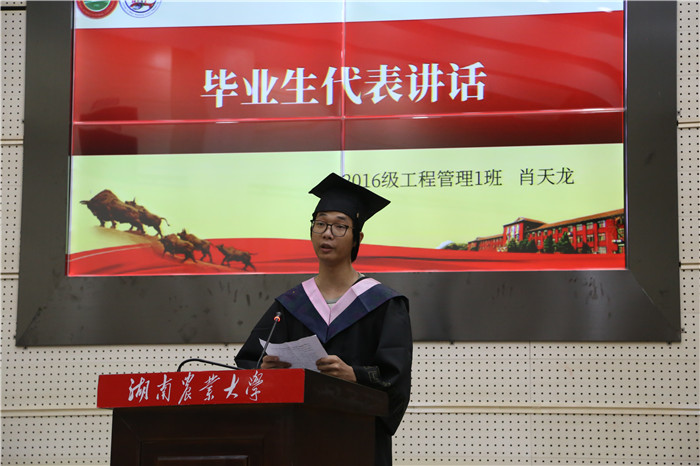 典礼上,毕业生代表2016级工程管理一班肖天龙同学,教师代表土木工程系刘保华副教授先后发表讲话。其中,肖天龙同学在讲话中表达了对公司、公司、老师的感恩之情以及祝福之情。刘保华老师带领同学们回忆了四年来的点点滴滴,分享了她的母校情怀。在讲话的最后,刘保华老师嘱咐同学们做一个有爱、有担当、有格局、阳光、博学的人,“有空常回公司看看”。