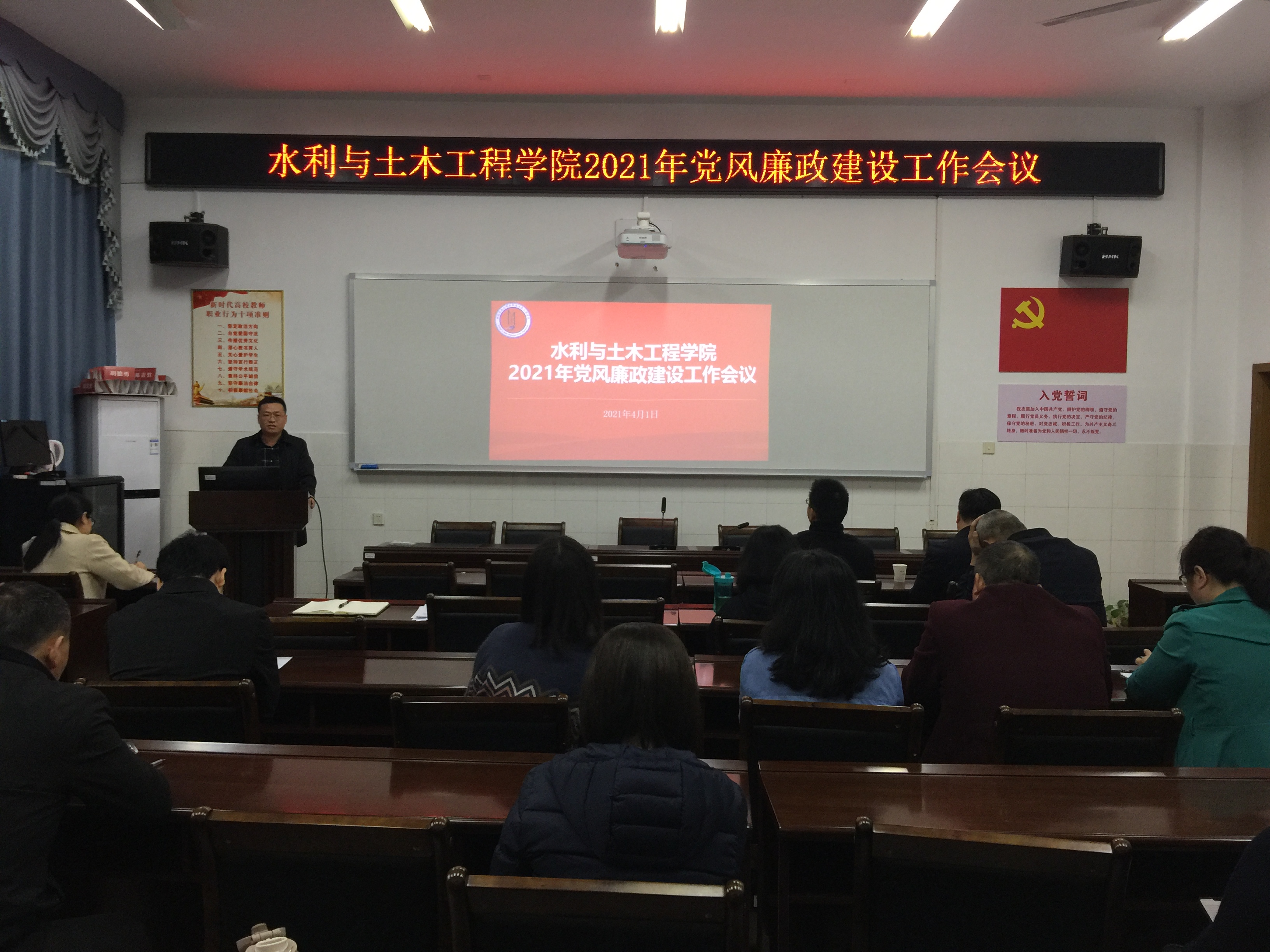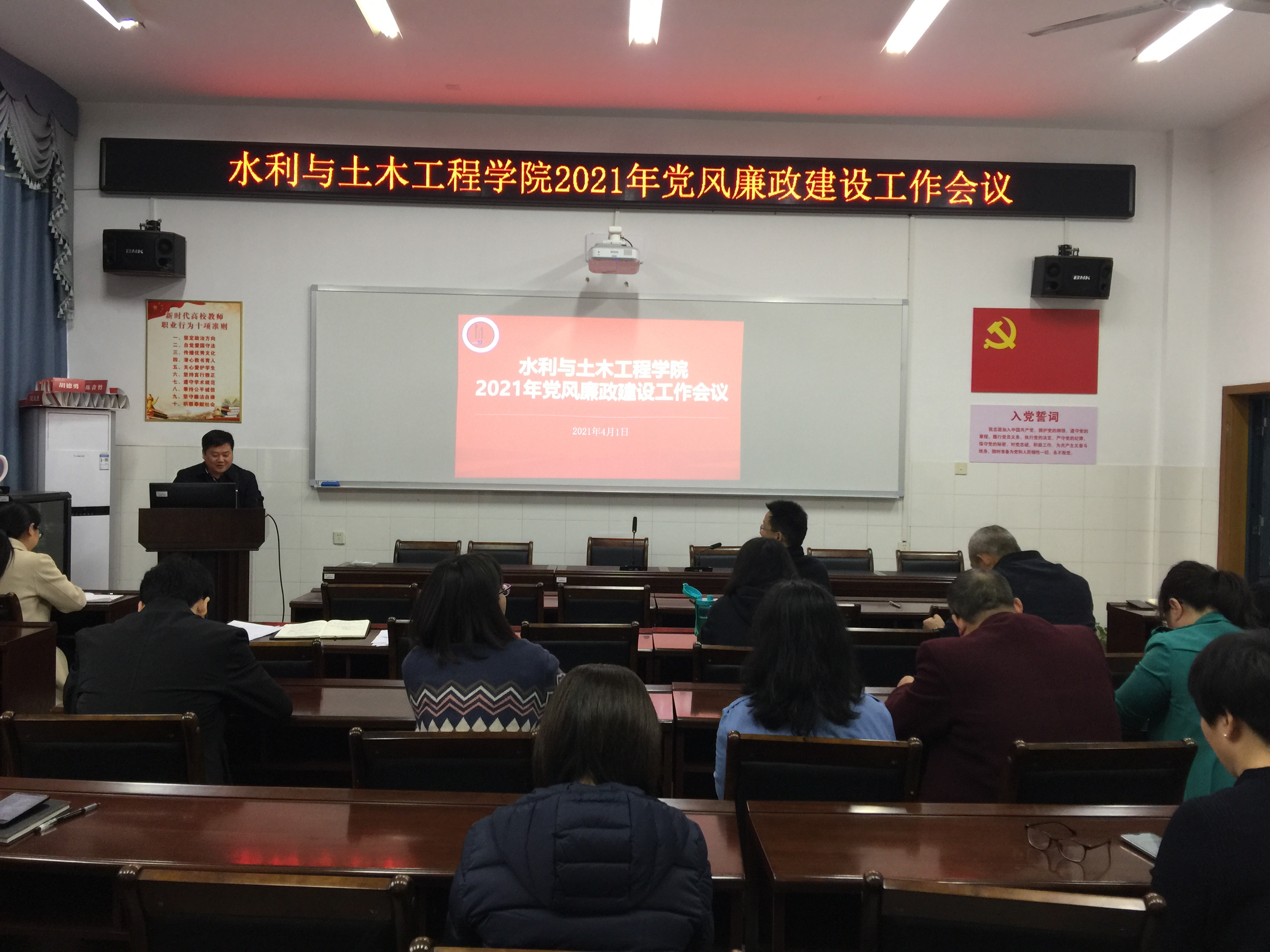 公司党委书记胡德勇就如何加强和改进公司党风廉政建设工作进行了强调。他指出,党风决定政风、院风,决定教风、学风,全院师生党员要提高政治站位,进一步增强廉政意识,改进学风教风和工作作风。要高质量高标准开展党史学习教育,要以课程思政建设效果和“三全育人”实效来检验党史学习成效。要长鸣廉洁从政、廉洁从教的警钟,要在全院上下营造风清气正、团结向上的良好氛围。